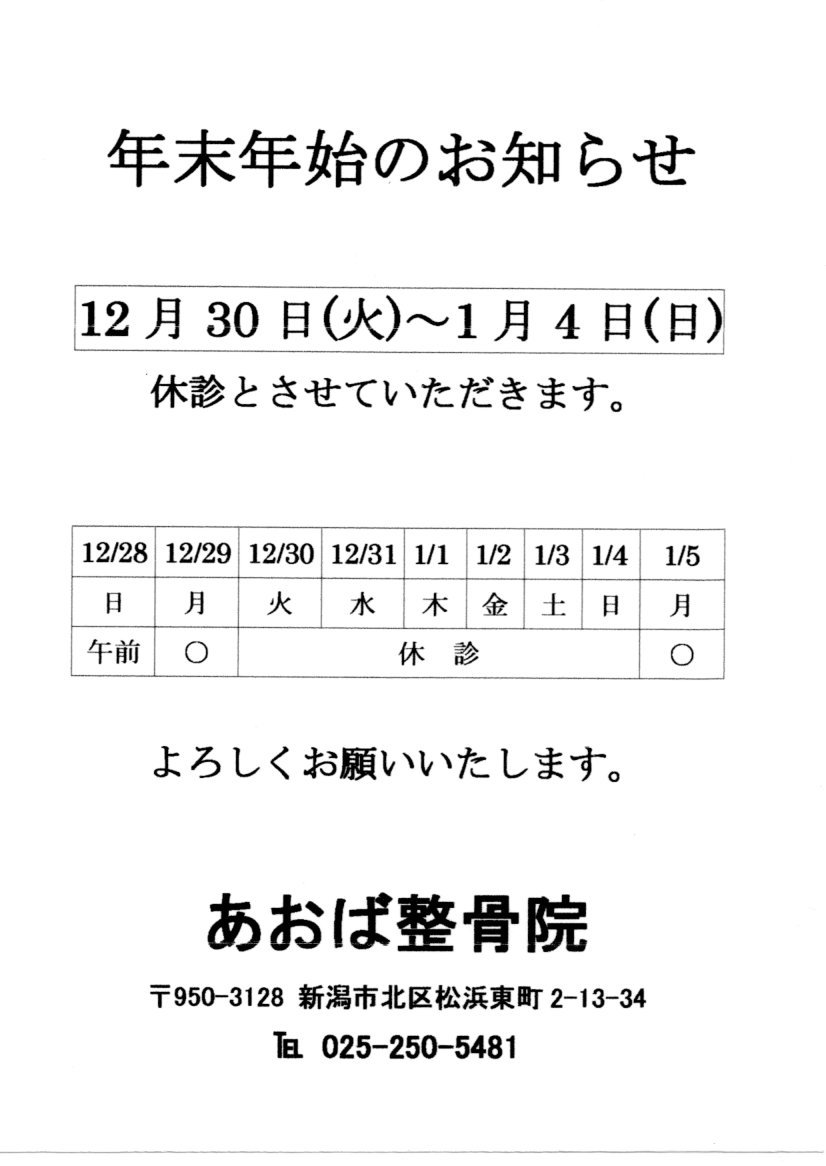 12月30日(火曜日)~1月4日(日曜日)は、お休みとなりますので、お間違いのないよう、よろしくお願いいたします。